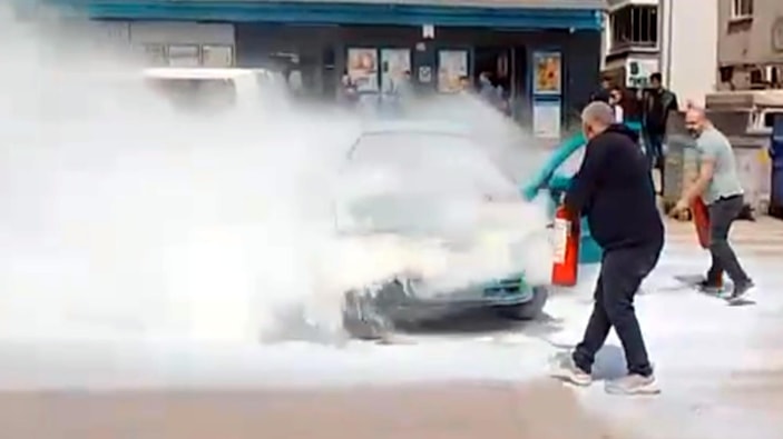Iğdır'da caddede park halindeki otomobilde çıkan yangına ilk müdahaleyi çevredekiler, yangın söndürme tüpleriyle yaptı.