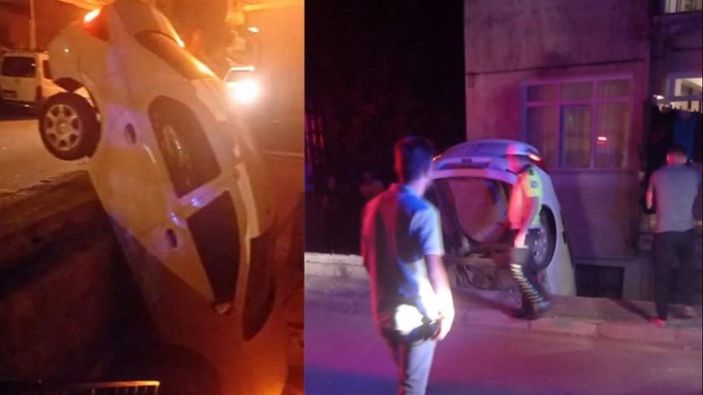 Merdan Y. ifadesine başvurulmak üzere polis merkezine götürülürken, bahçeye uçan otomobil ise vinç yardımıyla çıkarıldı.