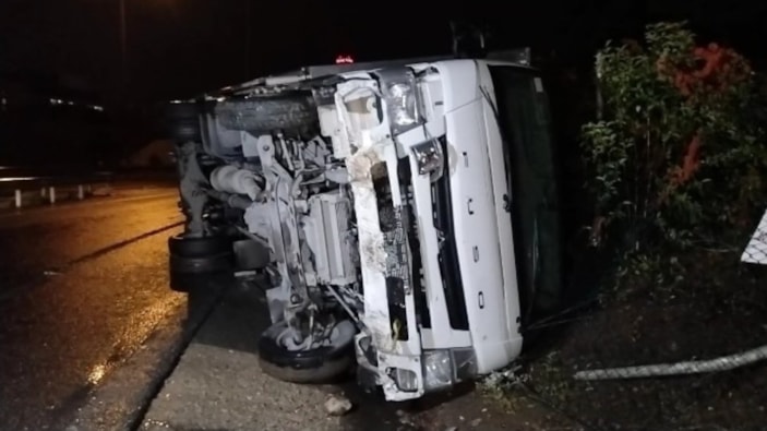 İstanbul Ataşehir'de kayganlaşan yolda virajı alamayan kamyonet devrildi