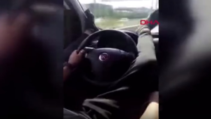 İstanbul’un Şile Otoyolu’nda otomobilin direksiyonunu ayakları ile tutarak yol alan sürücüyü, aynı araçta bulunan arkadaşı cep telefonuyla kaydetti.