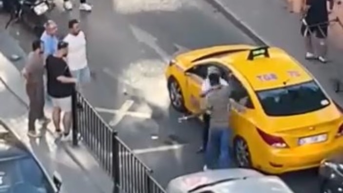 Elinde silahla otomobilden inen sürücü, taksi şoförünü tehdit edip yumruklayarak darbetti.