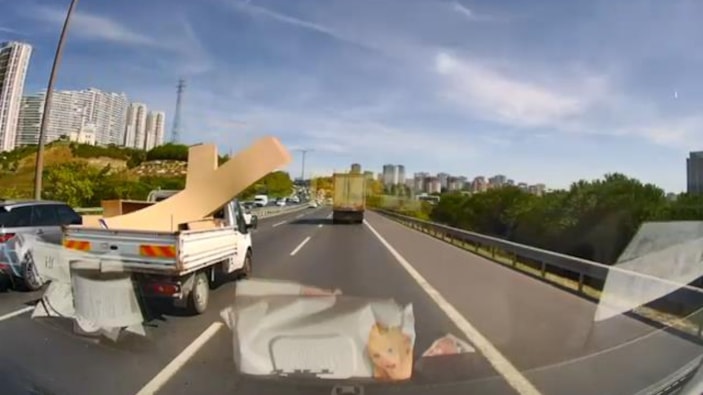 Avcılar'da Mahmutbey gişelere doğru ilerleyen kamyonetin kasasında sabitlenmeyince uçan malzemeler, arkadan gelen sürücülere tehlike yaşattı. O anlar kameraya yansıdı.