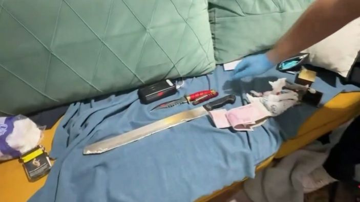 Evde yapılan aramalarda 35,5 gram metamfetamin, 17 adet uyuşturucu hap, bir hassas terazi, bir tabanca ve dokuz fişek, iki bıçak, üç cep telefonu ile 6 bin 910 lira nakit para ele geçirildi.