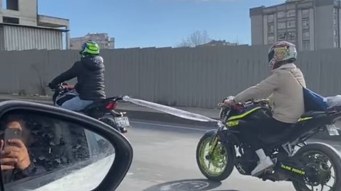 Küçükçekmece'de yolda arızalanan motosikletin başka bir motosiklet sürücüsü tarafından plastik poşet bağlanarak çekildiği anlar kameralara yansıdı.