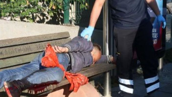 Yaralı, gücü tükenince otobüs durağındaki banka yığıldı. Aşırı kan kaybeden kişi, ambulansla hastaneye kaldırıldı.