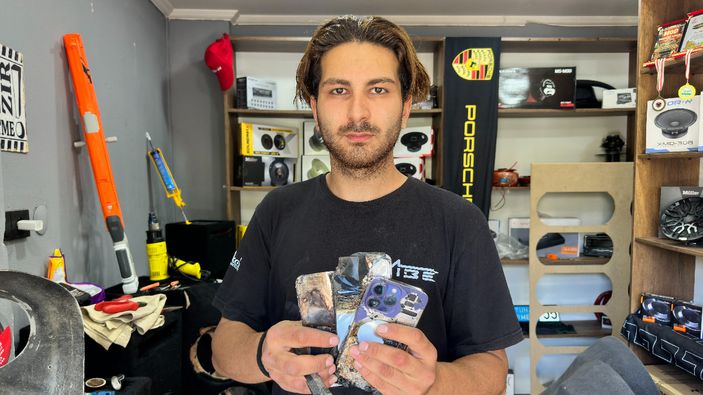 İlçede oto araç ses ve görüntü sistemleri işiyle uğraşan Batuhan Sürmeli çalıştığı sırada cebindeki İPhone 14 Pro Max model cep telefonu bir anda yanmaya başladı.