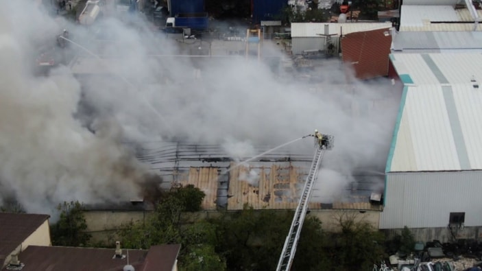 Öte yandan, fabrikadan yükselen yoğun duman ve itfaiyenin müdahalesi dron ile görüntülendi.