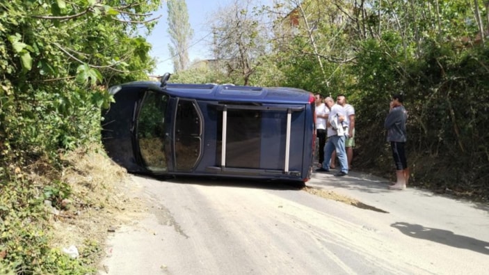 Yokuş aşağı kayan araç, önce yolun sağındaki taşlık alana vurdu. Ardından takla atarak durabildi.