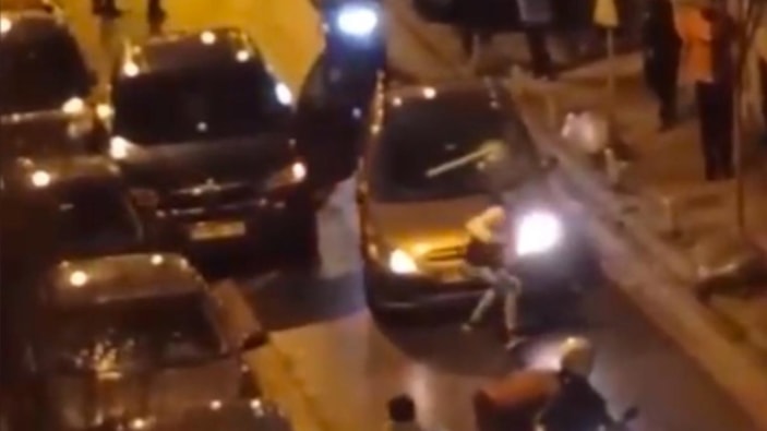Kağıthane'de çarptığı araçtaki kişiler tarafından darbedilen sürücü, elindeki sopayı aracın ön camına sapladı. Sokak ortasında yaşanan olay, cep telefonu kamerasına yansıdı