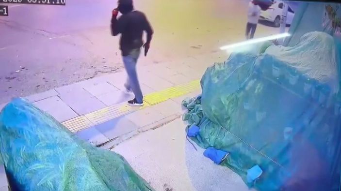 Görüntülerde, silahlı bir şüphelinin iş yerinin önünde durduğu, diğer şüphelilerin ise kasayı taşıyarak dışarı çıkardıkları görülüyor.