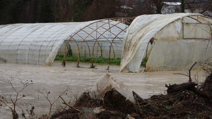 Bugün etkili olan sağanak yağışın da etkisiyle dere taştı. Derenin taşması nedeniyle çevredeki seralar sular altında kaldı.