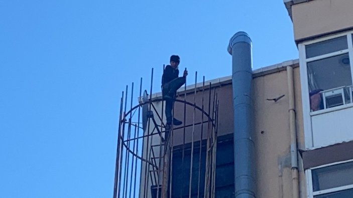 Sokak üzerindeki yangın merdiveninin giren genç, yoldan geçen bir vatandaşa “abi polisi ara” dedikten sonra tepesine çıktı.