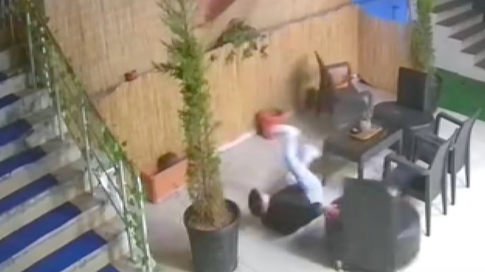 Bir işletmenin bahçesine düşen genç tekrar yerden kalkarak kavga etmeye devam etti.