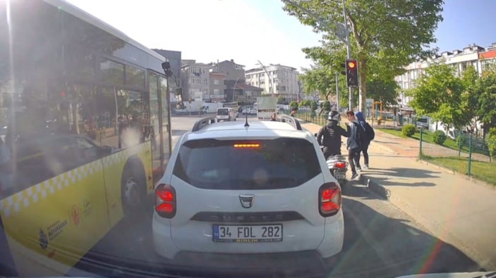 Sultangazi'de kırmızı ışıkta geçmek isteyen motosiklet sürücüsü, okula gitmek için karşıya geçmeye çalışan bir öğrenciye çarptı. Sürücü hem öğrenciye hem de kendisini uyaran bir kadına bağırdı. O anlar kameraya yansıdı.
