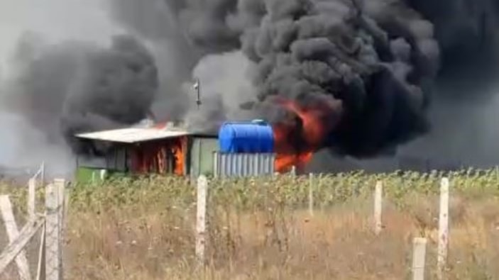 Silivri’de göletin yanında bulunan konteynerde yangın çıkarken, kısa sürede büyüyen alevler de buğday tarlasına sıçradı.