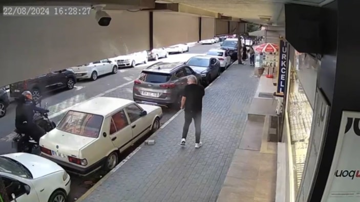Görüntülerde, motosikletle sokağa gelen kasklı iki kişiden artçı olanın iş yerlerine silahla ateş ettiği, o esnada telefonla konuşarak kaldırımda yürüyen bir kişinin kendisini yere atarak son anda kurtulduğu görülüyor. Polis, olay yerinden kaçan saldırganların yakalanması için çalışma başlattı.