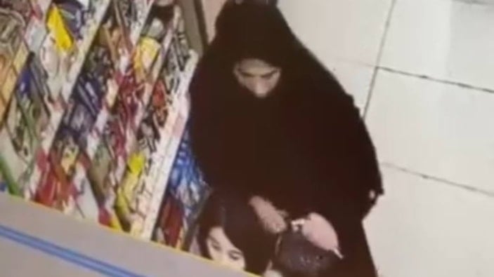 Görüntülerde, kadın şüphelinin rafın üzerinde duran cep telefonu fark etmesinin ardından çantasına koyması ve marketten alışveriş yaparak çıktığı anlar yer aldı.