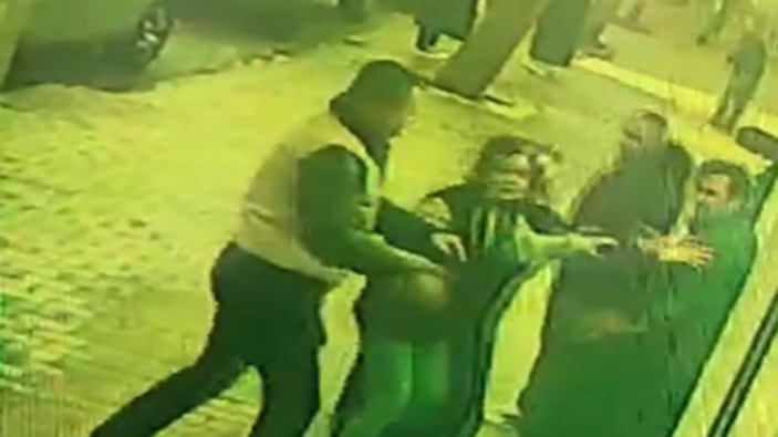 Kavga iş yerinin dışına taşarken yaşanan o anlar, güvenlik kamerasıyla saniye saniye görüntülendi.