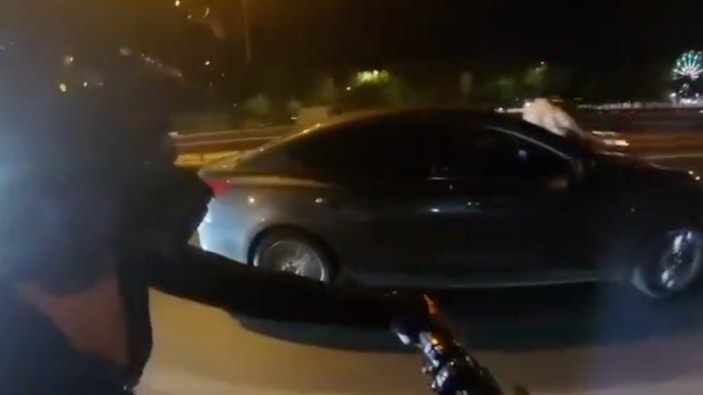 Daha sonra otomobilin diğer önünü kestiği motosiklet sürücüleri, kornaya basarak otomobili durdurmaya çalıştı.