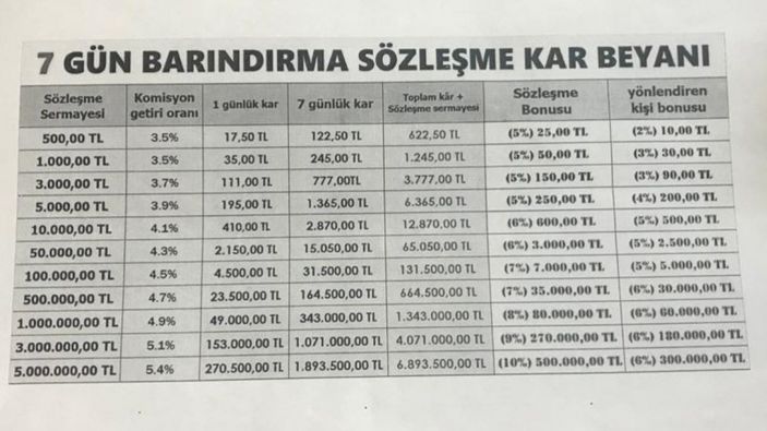 Dilekçede, "15, 60, 180 ve 365 gün vadelerle kar payı veriyorlardı. Günlük çekilecek para 269 liraydı 2-3 gün çektim ve parayı verdiler. Onun dışında birebir bonus vermeye başladılar. 5 bin liraya 5 bin lira bonus veriyorlardı. Biz para çekme talebinde bulunduk ancak yoğunluk olduğu için gecikme olduğunu söylediler. Daha sonra devletin yüzde 5 vergi aldığını öderseniz ödemenizi alırsınız diye söylediler. Bunu yatırıp talepte bulunduk ancak hesabımıza para girişi yapılmadı. Gruplara engelleme koydular, kimseye ulaşamıyoruz. Şüpheliler hakkında gerekli kamu davasının açılmasını talep ediyorum." denildi.