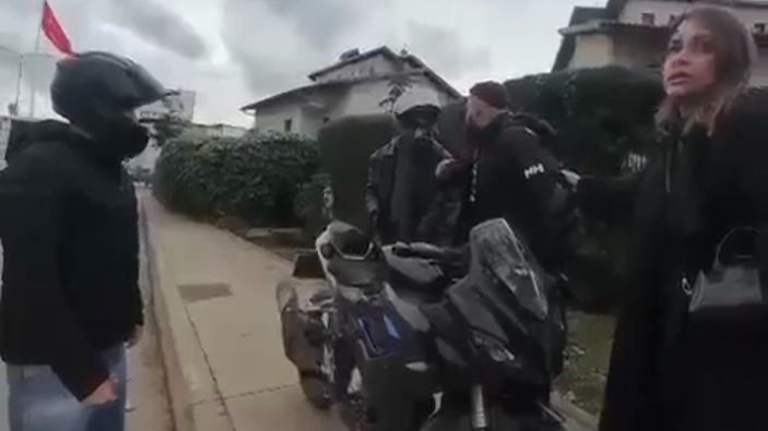Küfrederek bıçağı savuran motosiklet sürücüsü, gruptakilerin olayın şaka olduğunu anlatmasına rağmen tehditlerini sürdürdü.