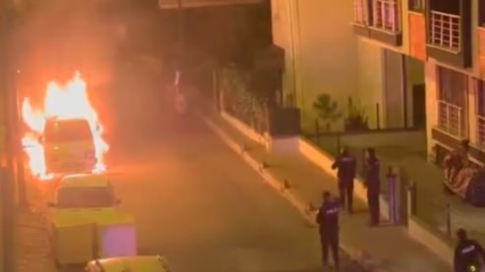 Görüntülerde kamyonetten alevler yükseldiği ve bir süre sonra itfaiye ekiplerinin müdahale ettiği görülüyor.