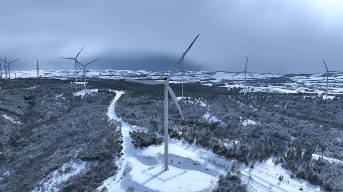 İstanbul'da etkili olan kar yağışının ardından Çatalca'da 200 metreyi aşan dev rüzgargülleri beyaza büründü.