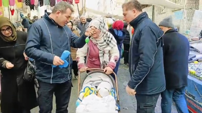 Bebek arabasında gezdirdiği küçük çocuğunun kanser olduğunu söyleyen bir kadın, pazar yerindeki insanlardan para istedi.