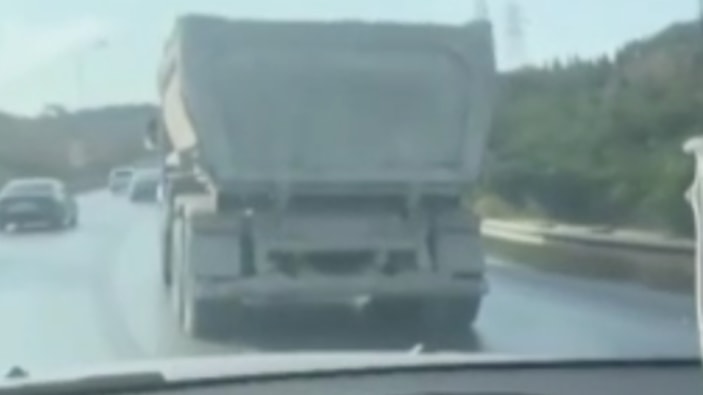 Seyir halinde olan bir hafriyat kamyonu yokuşta yavaşladığı esnada dorsesinde bulunan kilolarca beton caddeye döküldü. Yaşanan anlar kayda alındı.