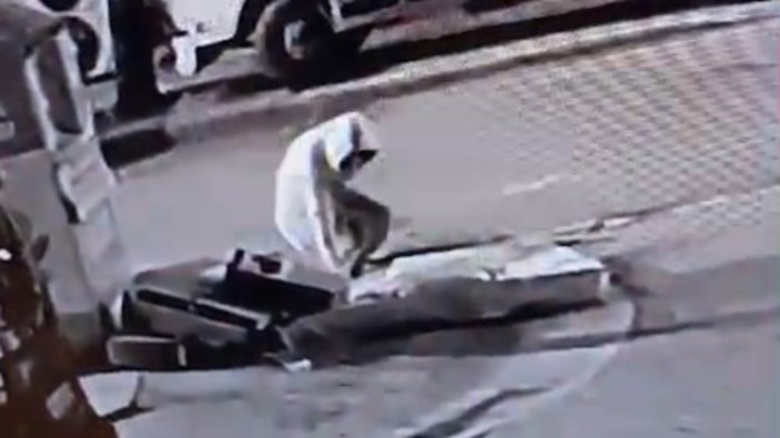 Görüntülerde; geri dönüşüm kumbarası yanına bırakılan yatağın sokaktan geçen bir kişi tarafından çakmakla tutuşturulduğu anlar görülüyor.