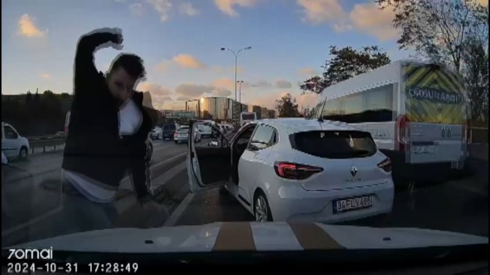 Trafikte yaşanan tartışma anları, araç kamerasına saniye saniye yansıdı.