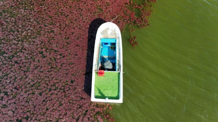 Havadan çekilen görüntülerde, gölün üzerinde duran sandalların etrafını kaplayan bitki örtüsü nadir görülen bir manzaranın oluşmasına neden oldu.