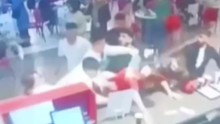 AVM'nin adeta savaş alanına döndüğü kavga anı, işletmenin güvenlik kamerasına saniye saniye yansıdı.