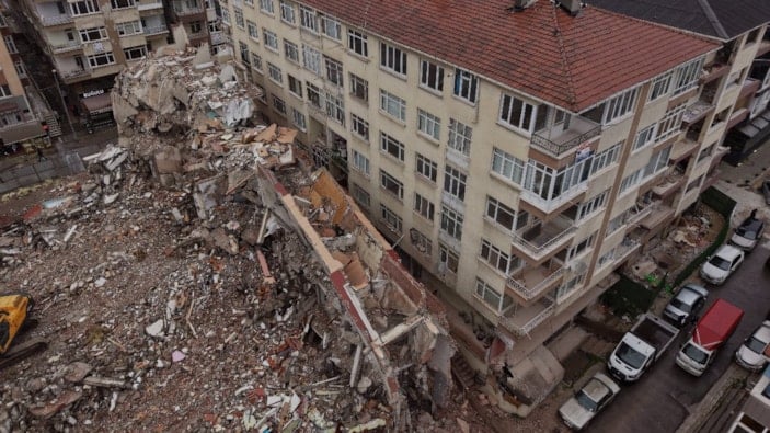 Öte yandan yıkım çalışmalarının devam ettiği alan havadan görüntülendi.