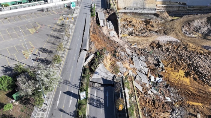 Ümraniye'de bir inşaat alanında yapılan çalışmalar sırasında istinat duvarının yıkılması sonucu yolda çökme meydana geldi. Korku dolu anlar bir vatandaşın cep telefonu kamerasına yansıdı.