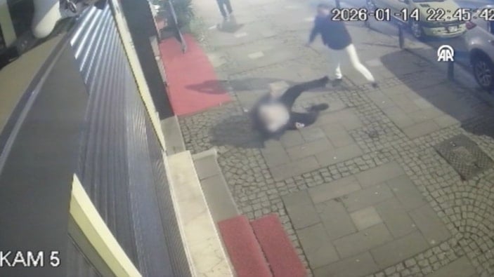 Çevredeki bir iş yerinin güvenlik kamerasına yansıyan görüntülerde, yolda yürüyen kişiye arkasından koşarak gelen saldırganın tekme atarak yere düşürmesi, elindeki cisimle birkaç kez vurduktan sonra hızla uzaklaşması yer alıyor.