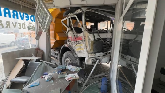 Moloz yüklü kamyon yokuştan kayarak park halindeki otomobile çarptı, ardından da bir iş yerinin bürosuna girdi.