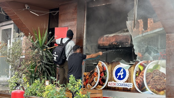 Arnavutköy'de bir kebap salonunda çıkan yangına çevredeki hortumla müdahale eden Afrikalı vatandaşın görüntüleri kameralara yansıdı.