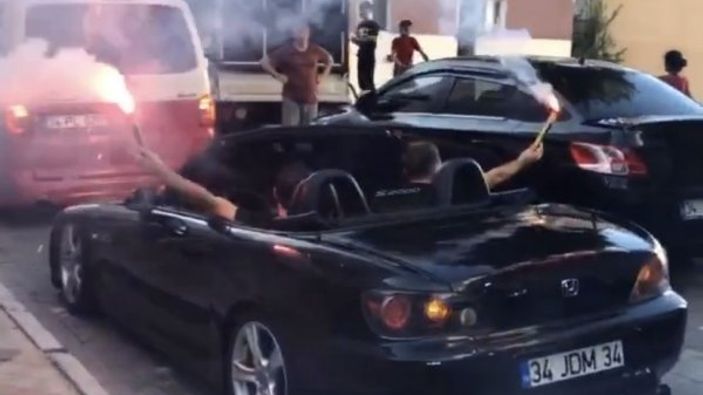 Eğlencenin ardından ultra lüks araçlarına binerek konvoy halinde trafiğe çıkan grup, çakarlı araçlarla “dat dat” sistemini kullandı. Gürültü yaparak çevreye rahatsızlık veren grup, ellerine aldığı meşalelerle de ortalığı dumana boğarak trafiği tehlikeye düşürdü.