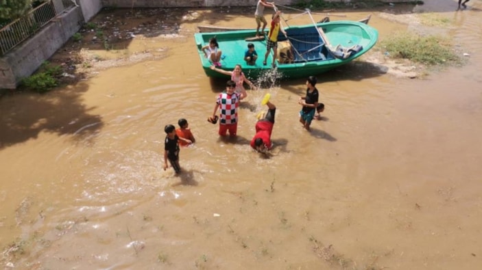 Vana arızası nedeniyle suyun akışı kesilemezken, mahallenin çocukları bir arsaya dolan su da yüzdü.