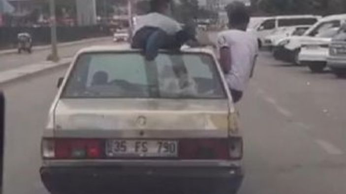 Konak ilçesinde, seyir halindeki bir otomobilin üzerinde duran kişinin görüntüsü izleyenleri hayrete düşürdü.