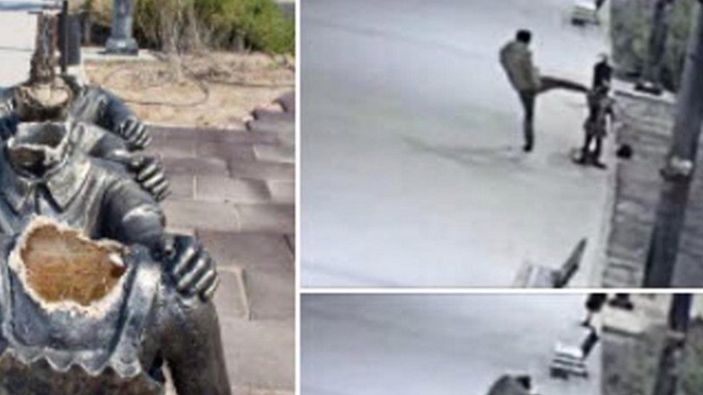 Güvenlik kamerası görüntülerini inceleyen ekipler, bir kişinin, yan yana dizili olan ve polyesterden yapılmış, birbirinin omuzlarına dokunarak hizaya girmiş 4 çocuk temalı heykellerin baş kısımlarını tekme atarak kırdığını belirledi.