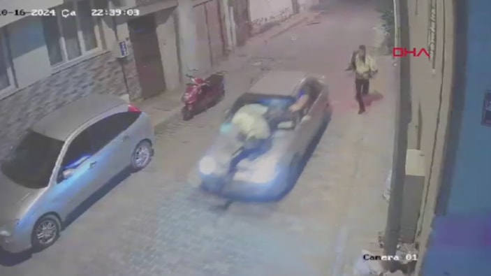 Ancak sürücü, aracını polis memurunun üzerine sürdü. Bunun üzerine polis memuru motor kaputunun üzerine atladı.
