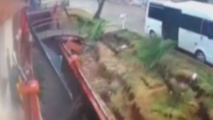 Aşırı yağışın etkili olduğu kentte, istinat duvarının çökme anı kameraya yansıdı.