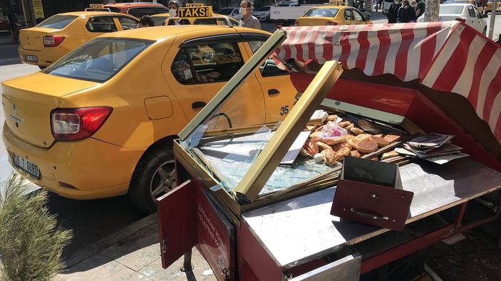 İzmir'de kazaya karışan taksi simitçi tezgahına çarptı