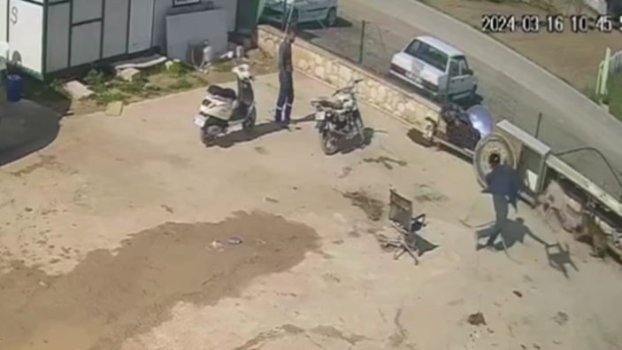 Hırsını alamayan saldırgan, etrafta bulunan bir motosikleti de devirdikten sonra hortumla vurduğu köpeğin daha sonra başına bir demirle, akabinde ise eline aldığı kürekle vurdu.