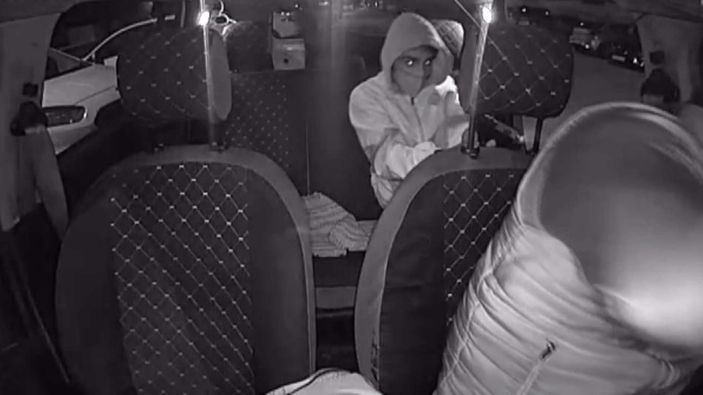 Saldırgan müşterinin taksi şoförünü oyaladığı anlar, araç içi güvenlik kamerasına yansıdı.