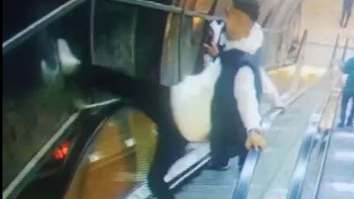 Yürüyen merdiveni kullanan 5 kişi, merdivenin yanındaki plastik korkuluklara yumruk ve tekmelerle zarar verdi.