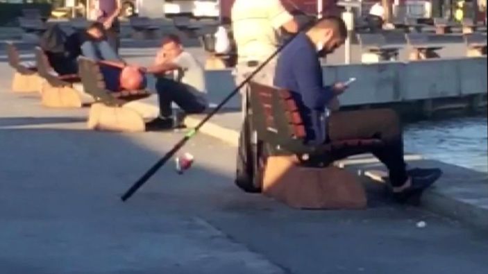 İstanbul Kadıköy iskelesinde bankta uzanarak uyuyan vatandaşın yanına yaklaşan şahıs, telefon ile konuşuyor gibi yaparak uyuyan adamın cüzdanını çalmaya çalıştı.