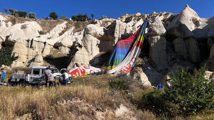 Sabah saatlerinde Avanos ilçesine bağlı Çavuşin köyünden havalanan sıcak hava balonlarından biri, Göreme beldesinde bulunan Aşk Vadisi'ne geldiğinde ters rüzgara kapıldı.